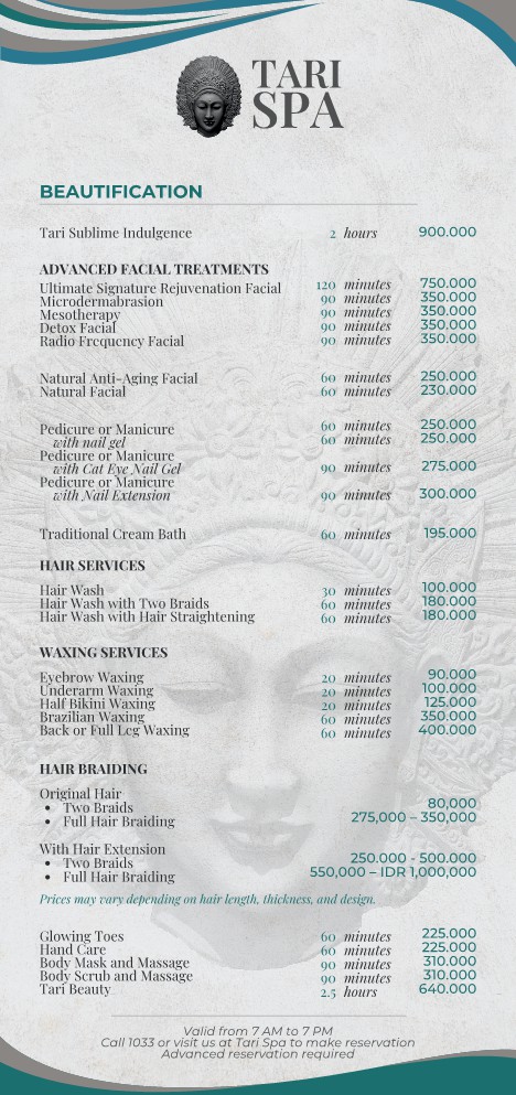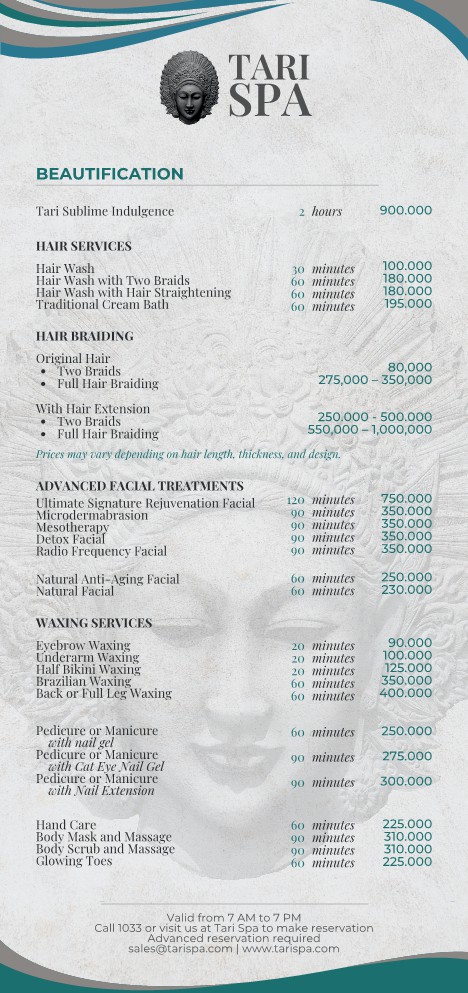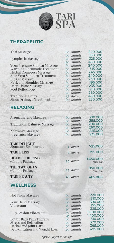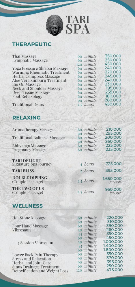 You will find everything you need at Tari Spa: treatments include massages, body masks and scrubs, facials, cream baths, manicures and pedicures, starting from Rp. 60,000 (A$6) per treatment. Our packages and couples package treatments are also available at special rates.
